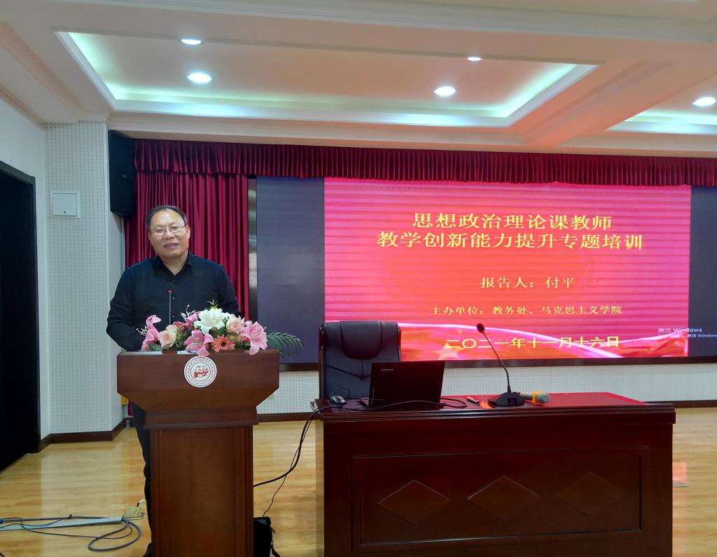 为提升思想政治理论课教学质量,提高教师队伍的教学能力,谈球吧联合教务处于2021年11月16日下午,在公司报告厅开展思想政治理论课教师教学创新能力提升专题培训。副董事长吕万翔出席此次活动,本次培训由谈球吧经理曹胜主持、机电工程公司付平教授主讲,全校专兼职思政课教师参加。