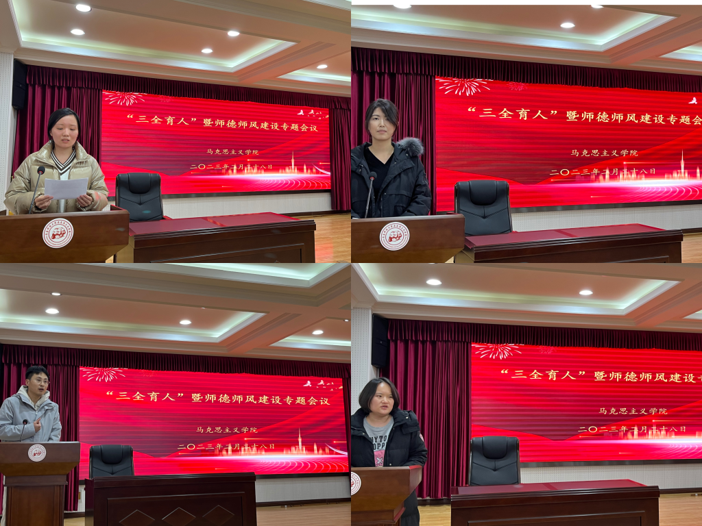 青年教师陈佩佩、闫鑫淇、田雨、刘彩萍先后作表态发言。陈佩佩表示,作为教师要加强师德修养、着力提升师德水平,深耕立德树人沃土,把满腔的热血、青春和力量洒在以道德为底色的教育事业上;闫鑫淇表示,要遵循《新时代教师职业行为十项准则》要求,牢记为谁培育人、培育什么样的人、怎样培育人的教育根本问题;田雨表示,要把握好育人方向,以身作则,在师德师风问题上严格要求自己,坚持立德树人、“三全育人”的基本原则;刘彩萍表示,要牢记政治使命,增强自身道德修养,做到以德立身、以德立学,做好本职工作。