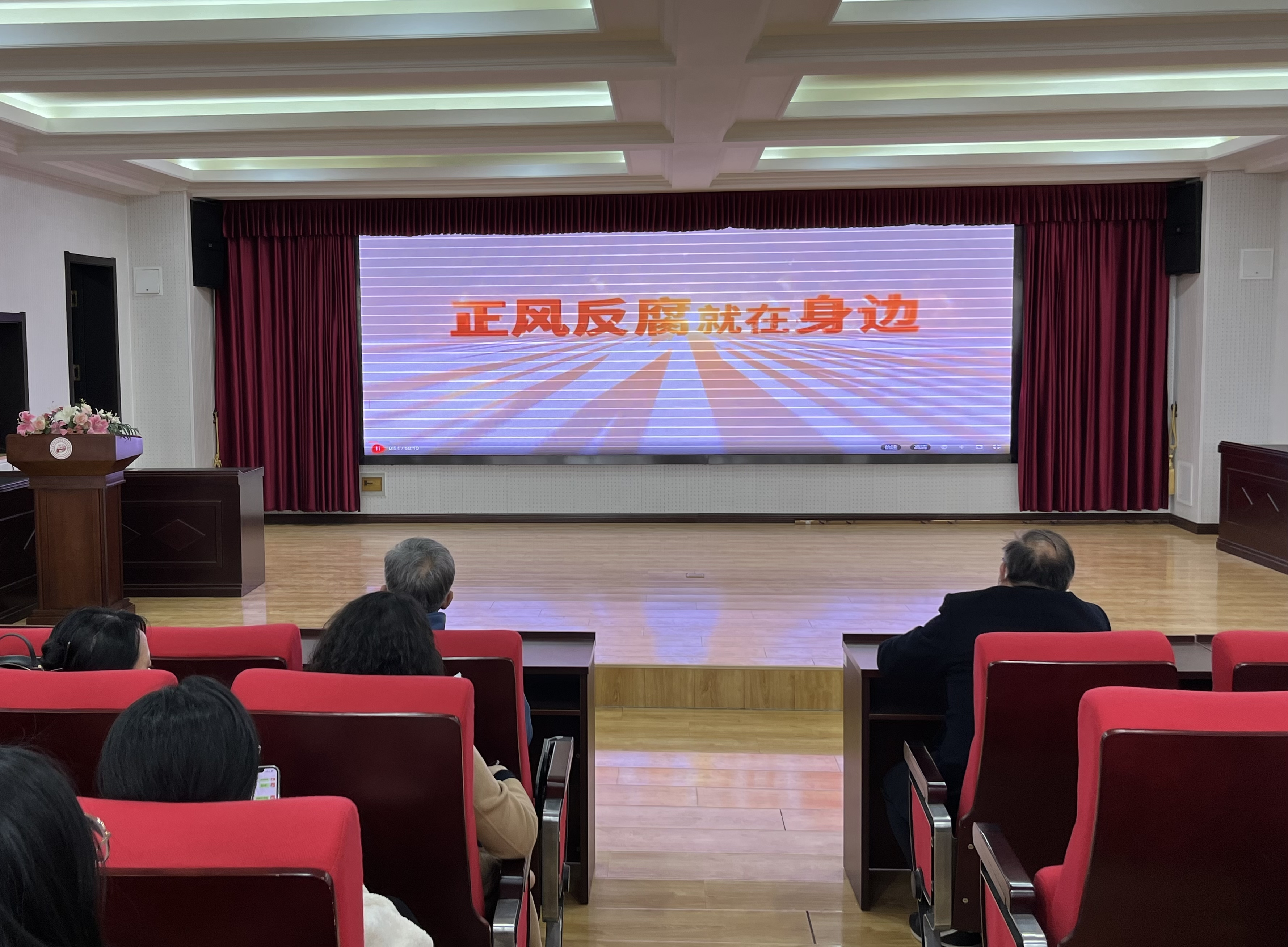 全体教职工集中观看警示教育系列片《正风反腐就在身边》第一集《政治监督》,该片通过讲述领导干部和公职人员失职渎职及腐败问题的查处情况,从多个角度揭示了案件中的腐败问题的根源:党性的丧失、利益的驱动、领导人员的虚假隐瞒等,让人触目惊心。一个个生动的案例反映了各级纪检监察机关以零容忍态度惩治腐败,使广大党员干部在思想上知敬畏、在行动中明职责,自觉提高党性修养,做到站得稳、行得端、立得正。