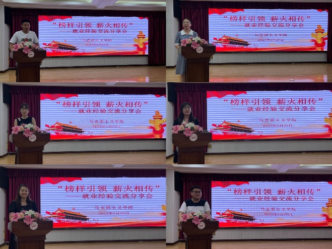六位毕业生分别从备考公务员、选调生、事业编、思政课教师、军队文职以及考博等方面进行经验交流分享。王宇以有理想、有韧劲、有信心为切入点详实讲述自身备考历程;张美围绕就业范围、考试范围与人才引进分享择业观;周梦以“青选计划”的基本要求与备考技巧为出发点总结经验;邹小祎就思政课教师的考试内容与试讲技巧分享经验;李娆从备考军队文职出发,遵循考前-考中-考后的逻辑进行详细讲解;刘航宇针对考博的信息收集、备考条件以及时间规划展开交流。随后提问答疑环节,同学们围绕选岗技巧、学业就业平衡、备考规划等提出疑问,六位毕业生进行详细的解答,并给予建议。