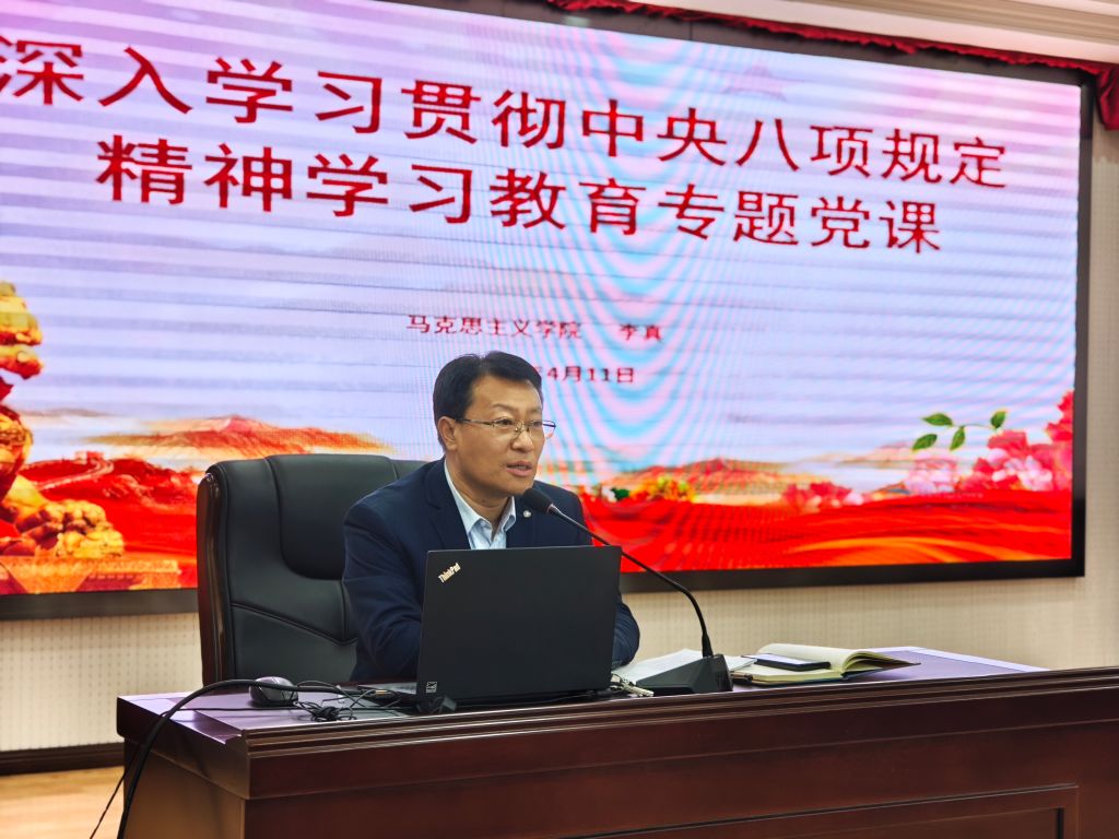 为深入学习贯彻落实中央八项规定精神,推进作风建设常态化长效化,4月11日下午,马克思主义公司党总支书记李真在公司学术报告厅开展深入贯彻中央八项规定精神学习教育专题党课。公司部分教职工和全体研究生参加此次活动。