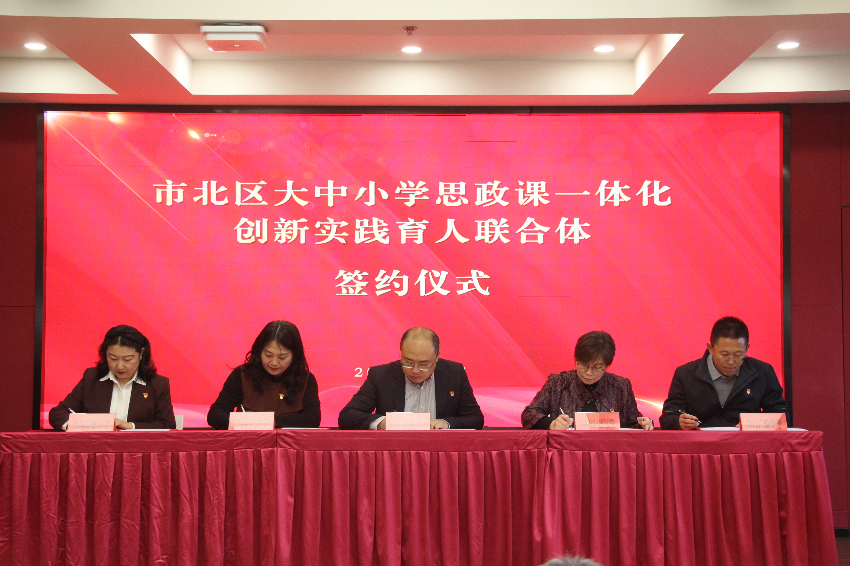 会上,杜选英、李卉及三所公司相关负责人共同签署《市北区大中小学思政课一体化创新实践育人联合体合作协议》。