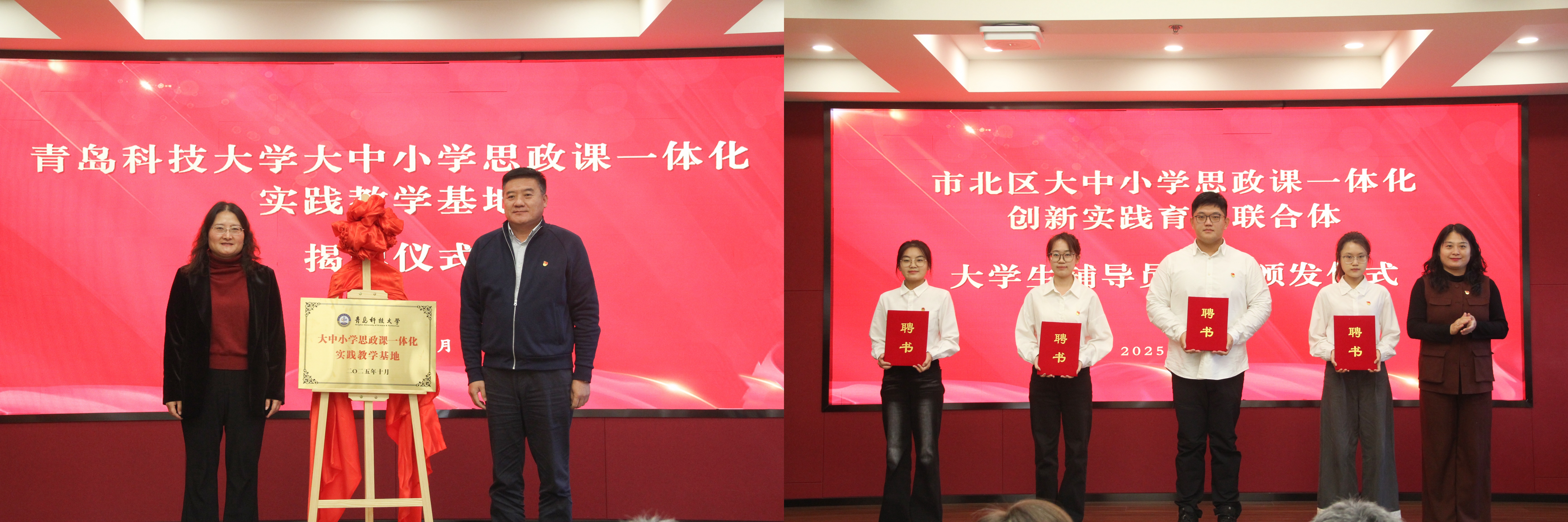 杨健与翟春燕共同为“市北区大中小学思政课一体化创新实践育人联合体”揭牌,王建美与李宾共同为“谈球吧网页版登录入口大中小学思政课一体化实践教学基地”揭牌。沈巧妮、马新卫、张欣分别为老员工辅导员代表颁发聘书,并合影留念。
