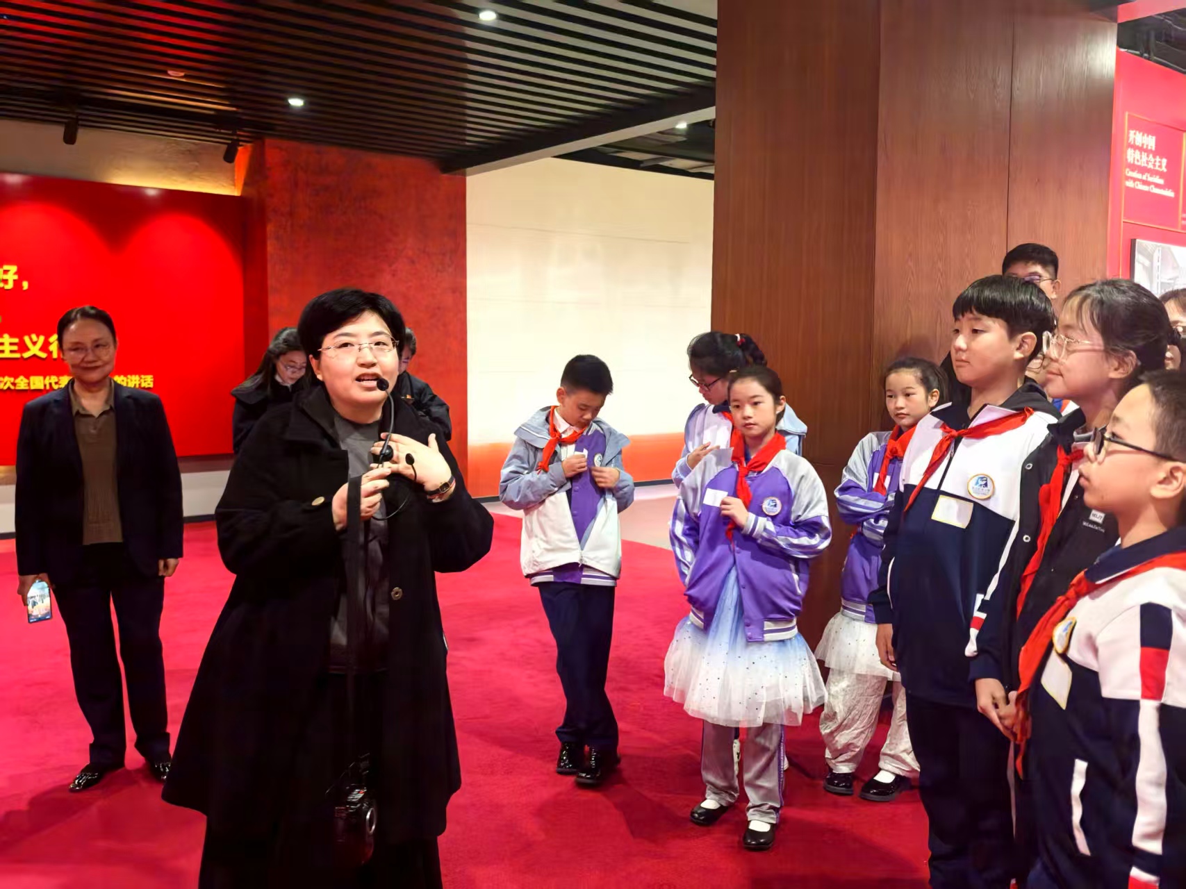 戴雪丽同老员工辅导员面向中小员工代表讲述了一堂生动的“场馆里的思政课”。课程以学习《共产党宣言》为主线,师生们通过展板讲解与代表发言等形式,生动诠释了信仰的力量与时代青年的使命担当。