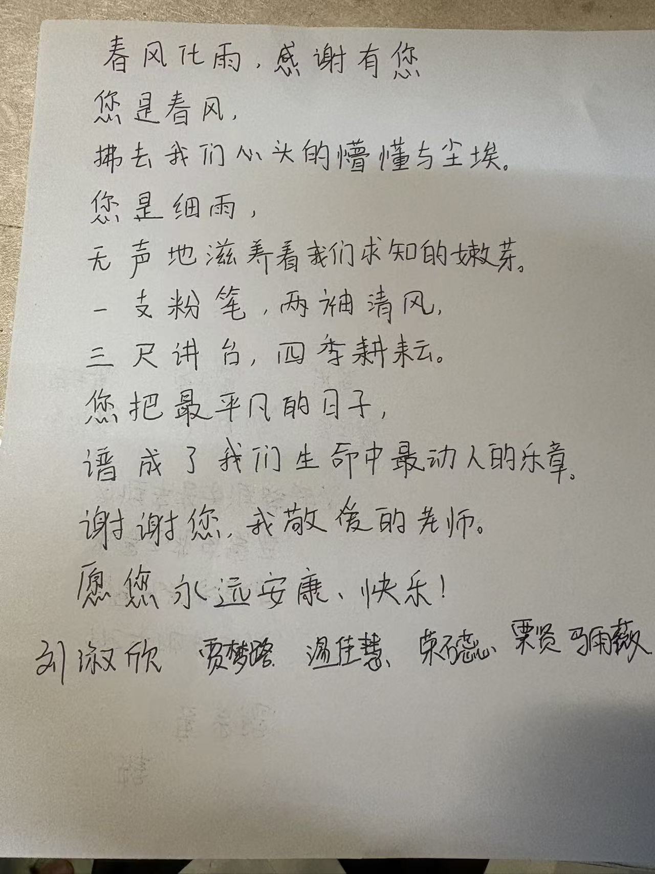 各宿舍充分发挥集体智慧与创意,作品形式丰富多样,每一份作品都凝聚着宿舍成员的共同心意,成为承载师生情谊的珍贵载体,尽显马院学子对恩师的深厚情感,切实推动形成“尊师、爱师、敬师、亲师”的浓厚院风。