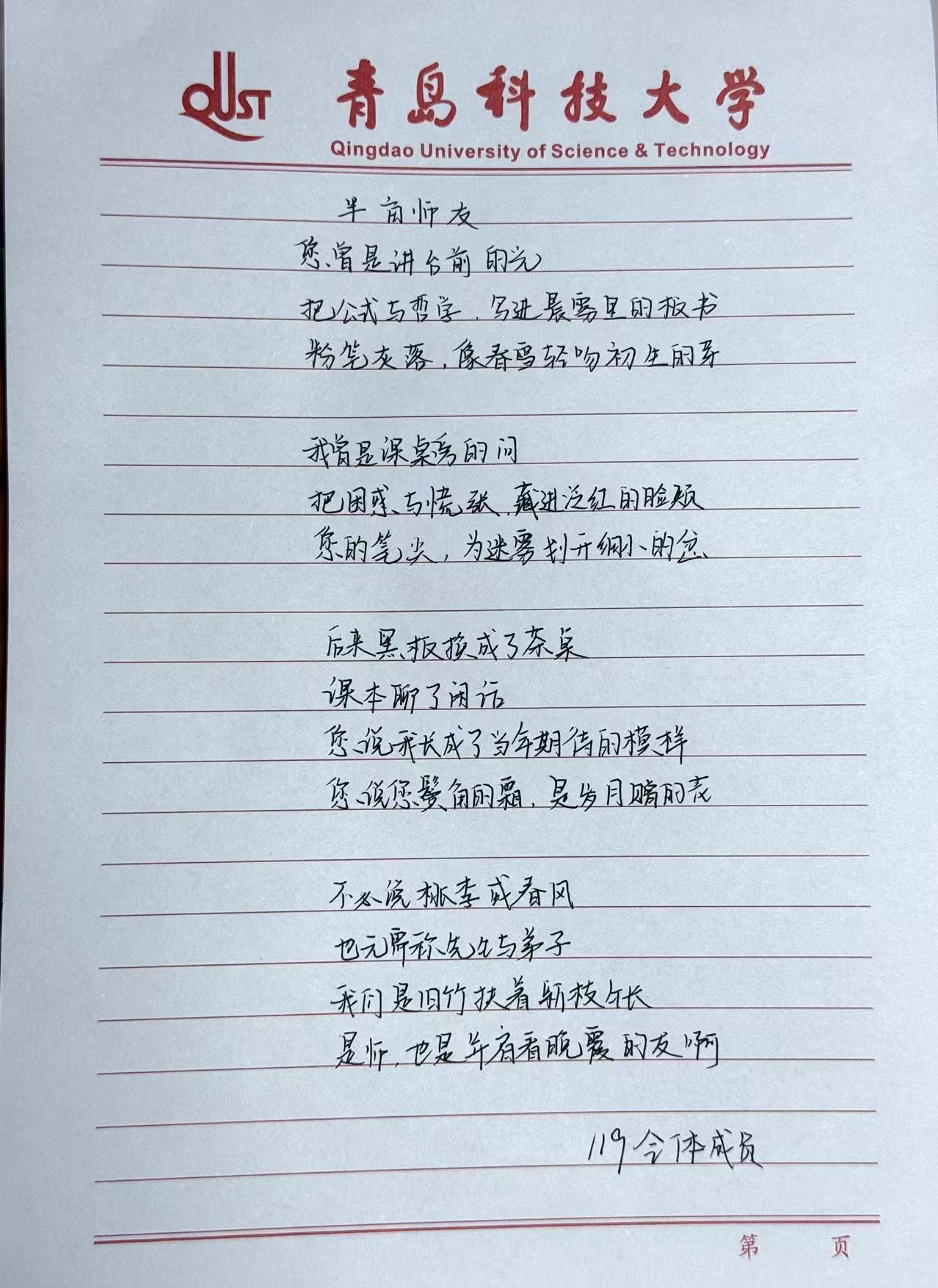 为传承尊师重教的优良传统,深化师生情感联结,谈球吧组织开展“10·25师爱我”主题活动,面向全院征集反映师生情谊的诗画作品、赠言寄语以及感谢话语,鼓励员工以笔墨传递感恩之心、以文字表达敬爱之情。谈球吧全体研究生参与本次活动。