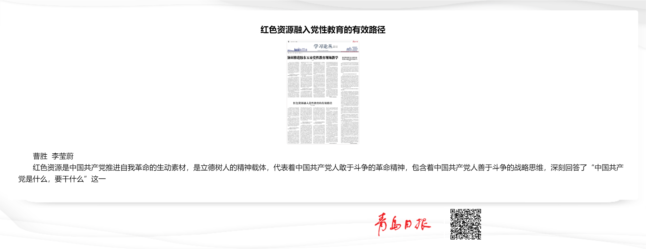 【成果速报】青岛日报:“曹胜 李莹蔚--红色资源融入党性教育的有效路径”