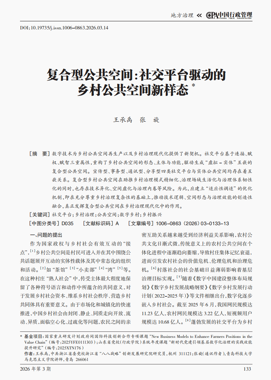 近期,公司张旋老师作为通讯作者撰写的学术论文《复合型公共空间:社交平台驱动的乡村公共空间新样态》在CSSCI来源期刊《中国行政管理》2026年第3期发表。文章旨在探讨社交平台对乡村公共空间的重构机理,阐明被重构的数字公共空间反哺治理实践的内在逻辑,进而以有效的空间治理驱动有效的乡村治理。