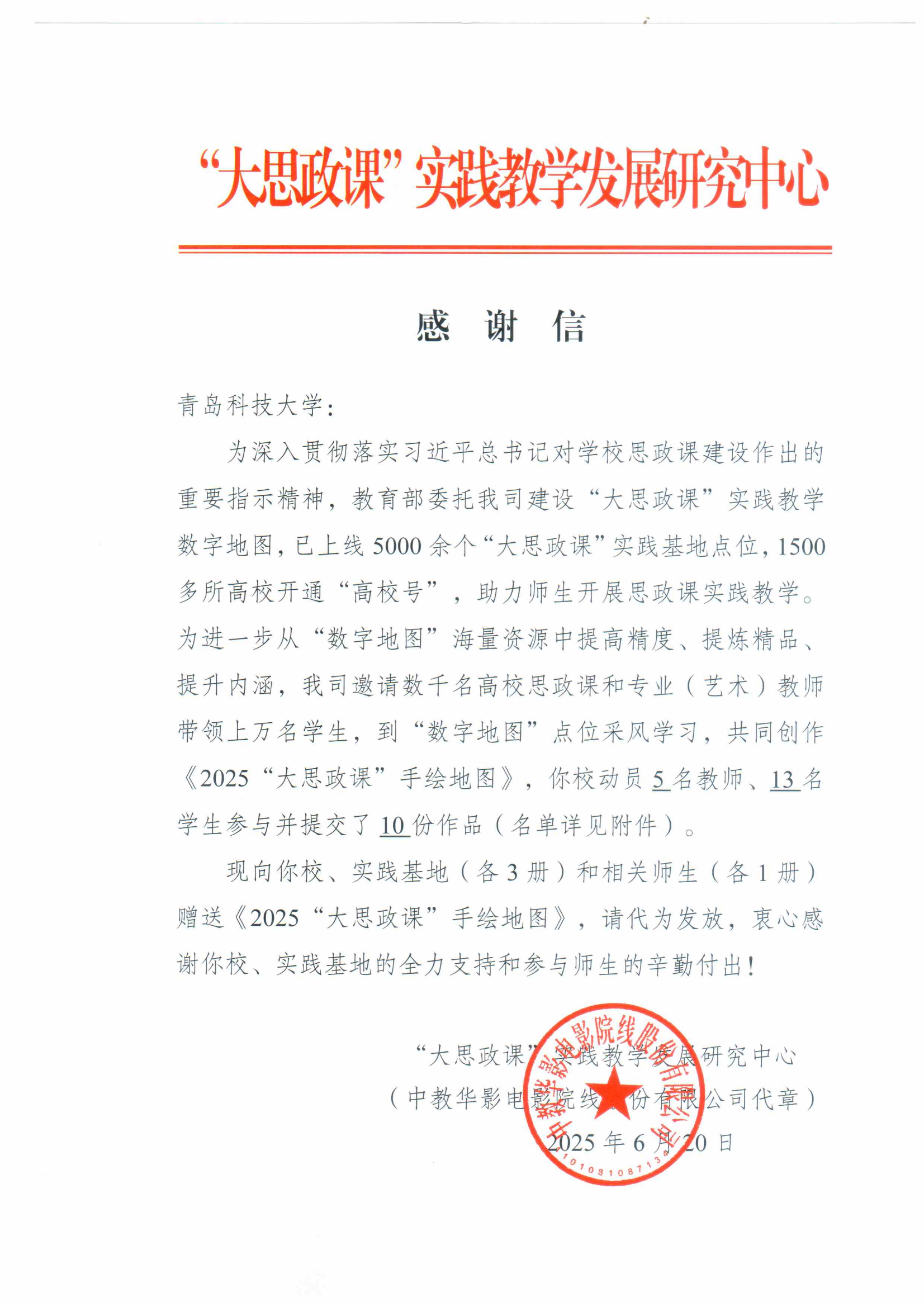 近日,“大思政课”实践教学发展研究中心向公司发来感谢信,对谈球吧网页版登录入口在《2025“大思政课”手绘地图》项目中的积极参与和组织工作表示诚挚感谢。经教育部遴选,山东省高校共入围6份作品,公司联合青岛纺织博物馆等制作的实践教学资源《工业遗产的活化典范:青岛纺织谷的文化建设探索》与《胜利油田功勋井手绘元素》成功入选。
