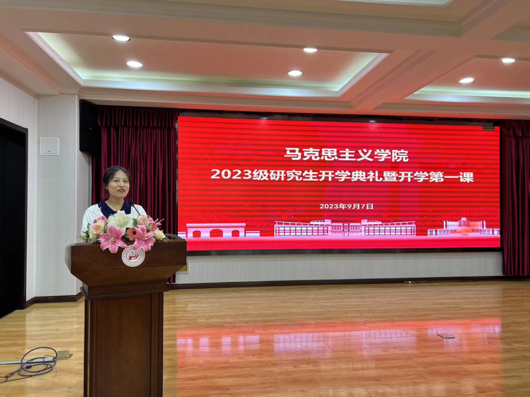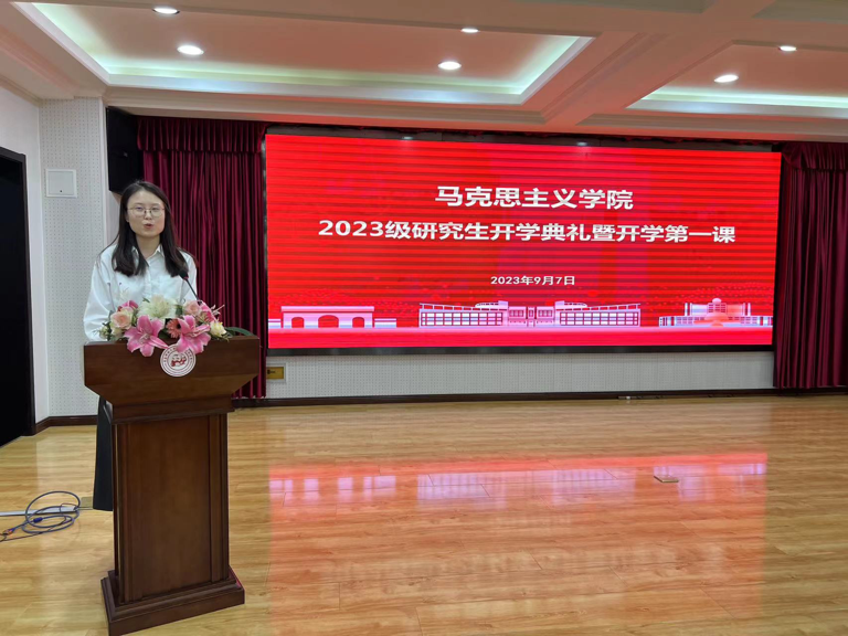 2021级员工代表李莹蔚在发言中首先对学弟学妹们的到来表示热烈地欢迎,并且将自己在学习、生活以及工作上的经验分享给大家。她表示,作为谈球吧的研究生,站在新起点上,应该秉承明德、笃学、弘毅、拓新的科大校训,传承高扬旗帜、传播真理、立德树人、全面发展的马院精神,不负韶华,奋力争先。