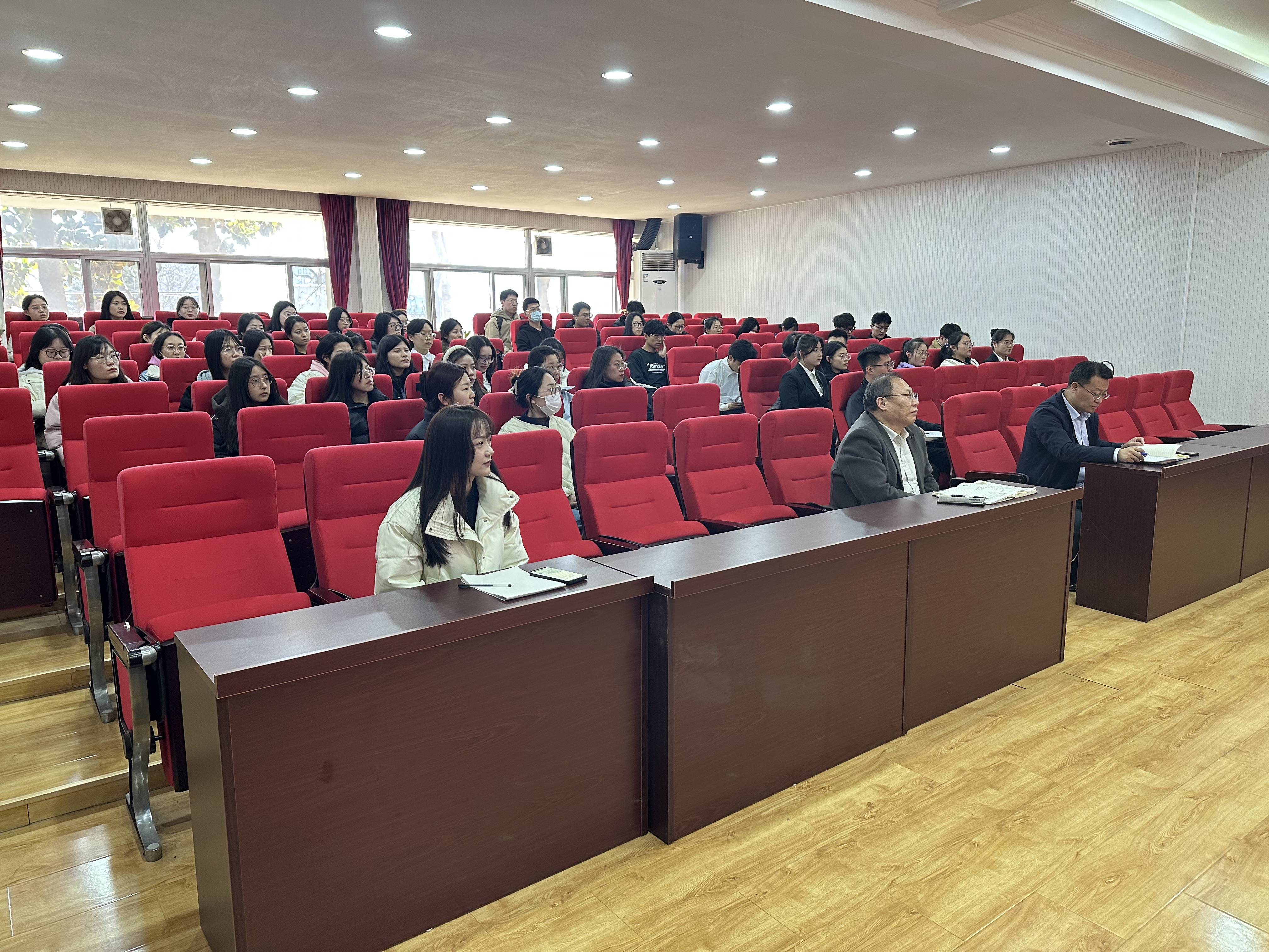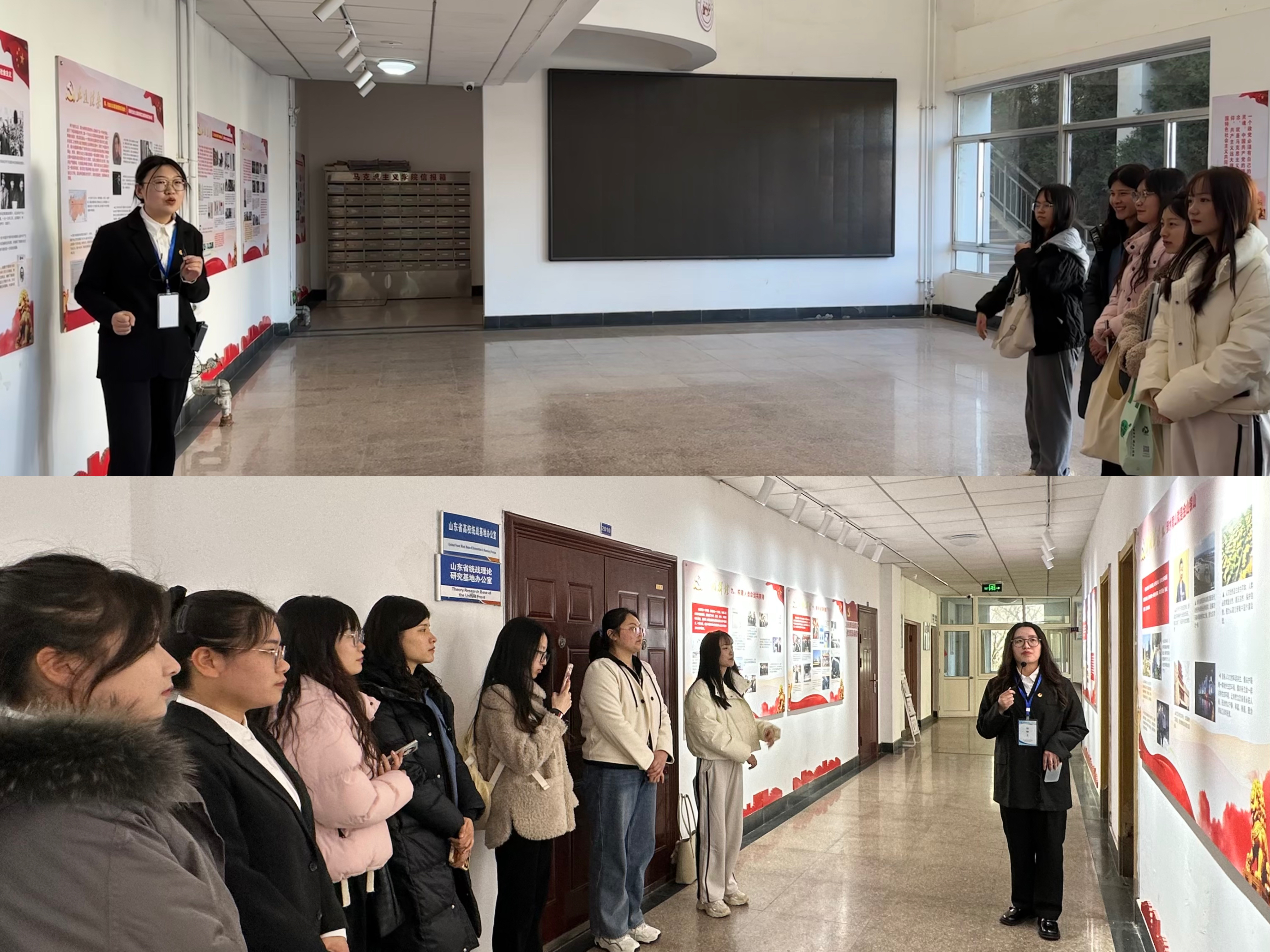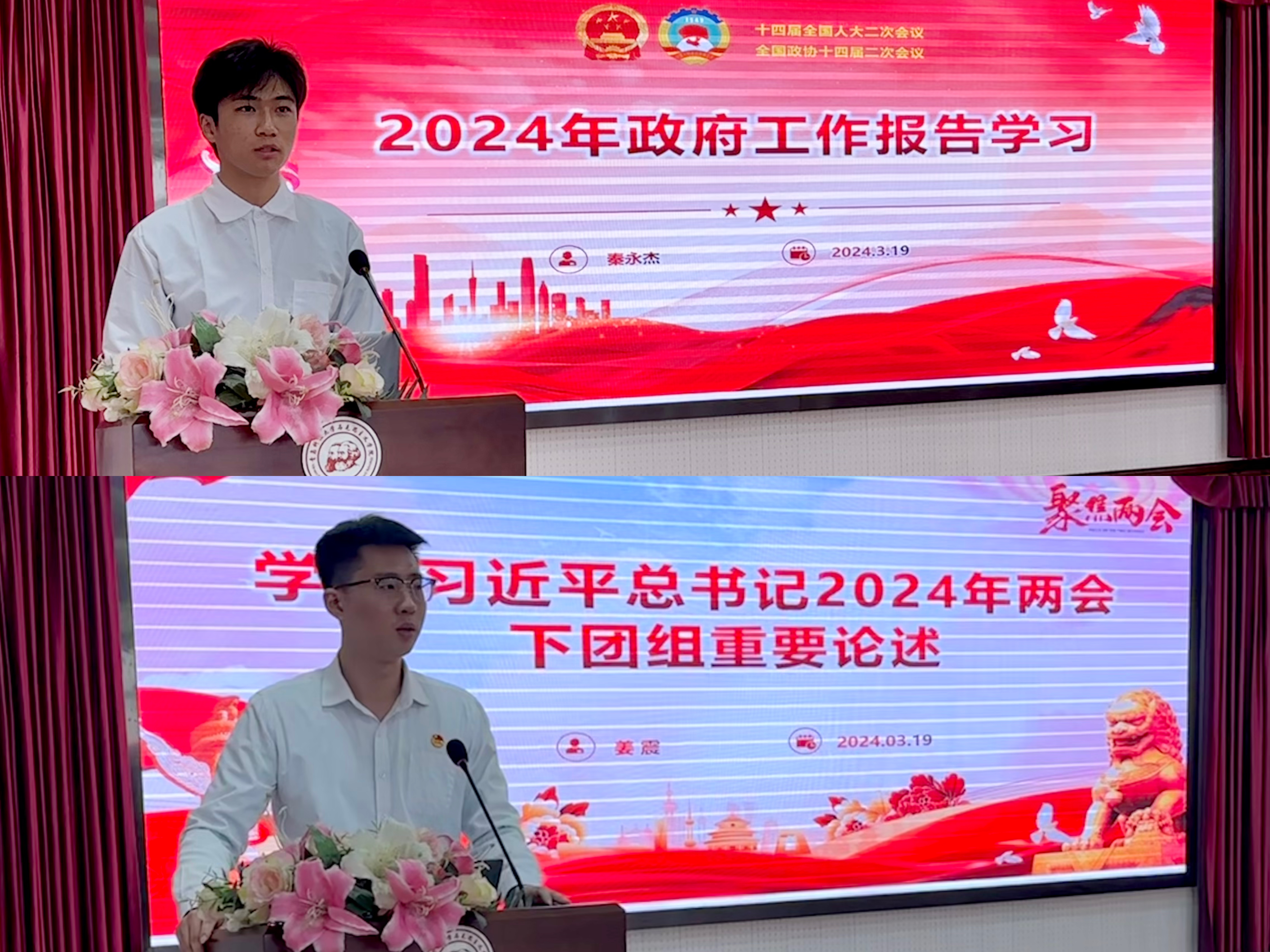讲授式领学。2022级团支部副书记姜震和2023级团支部副书记秦永杰,为大家讲解两会相关知识及今年热点内容。