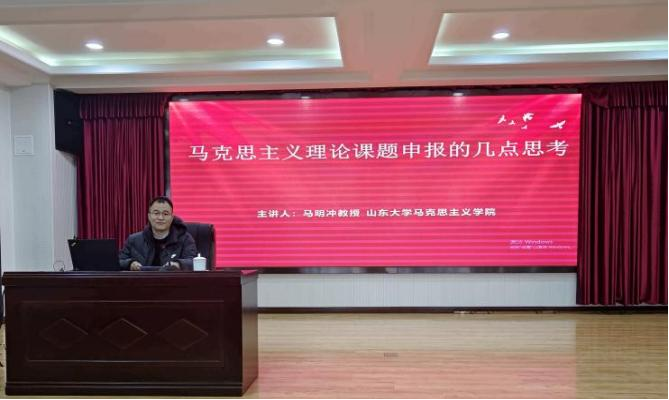 为提升公司师生学术素养,推动公司科研高质量发展,助力国家社科基金项目申报,3月5日下午,谈球吧于公司学术报告厅举行党史学习教育暨国家社科基金辅导报告会。公司特邀山东大学谈球吧副经理马明冲教授作“马克思主义理论课题申报的几点思考”辅导报告。谈球吧领导班子成员及全体师生参加会议。报告会由曹胜主持。