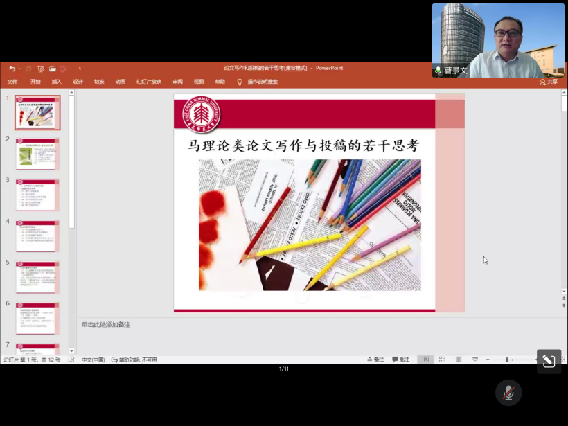 曹景文教授首先简要介绍了其主编的《思想政治课研究》的办刊宗旨、特色、发展历程及栏目设置等基本情况。其次,曹景文教授利用多年从事期刊主编的经历,结合杂志征稿要求与丰富的审稿经验,就“选题的基本原则”“论文题目的确定”“论文摘要和关键词”“论文的基本框架”“论文写作的顺序”“论文写作的基本原则”等方面详细梳理了马克思主义理论类论文的写作经验及需要注意和规避的问题。最后就投稿技巧和应注意的问题进行了全面指导。