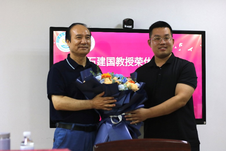 仪式上,工会主席姜竹青及2019级毕业生井震向石建国教授敬献鲜花和纪念品。