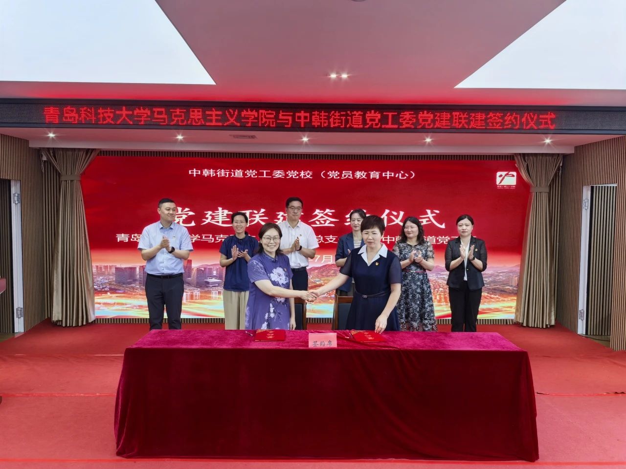为进一步推动校地融合共建与高质量发展,7月15日上午,公司与崂山区中韩街道党工委党建联建协议签约仪式于中韩街道党工委党校(党员教育中心)培训教室成功举办。仪式由崂山区党建工作办公室副主任张颖主持,崂山区区委组织部副部长、区委老干部局局长宋晓容,区党员教育中心主任丁杰,中韩街道党工委副书记、政协委员联络室主任,二级调研员曲爱菊,党工委组织委员、党建工作办公室主任隋忠雪,青岛科技大公司党委组织部正处级组织员王磊,副处级组织员齐青,马克思主义公司党总支书记李卉,副经理王建美出席仪式,公司宣讲团成员,中韩街道年轻干部,各社区党委副书记或组织委员、后备力量代表参加。