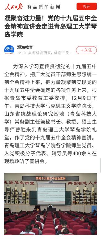 “学习贯彻落实党的十九届五中全会精神,是当前和今后一个时期的重要政治任务,我们会结合曹教授所做报告内容,学深悟透全会精神,指导工作实践,将个人理想,公司建设,国家发展紧密结合,和琴岛公司共同成长。我们会共同努力,谋划好公司的‘十四五’发展规划,计划好自己的发展目标,坚决落实立德树人根本任务,早日把琴岛公司建设成为高水平应用型大学,为国家发展民族复兴做出新贡献。”王乐生说。(青岛日报社/观海新闻记者 杨海涛 通讯员 孟琦)