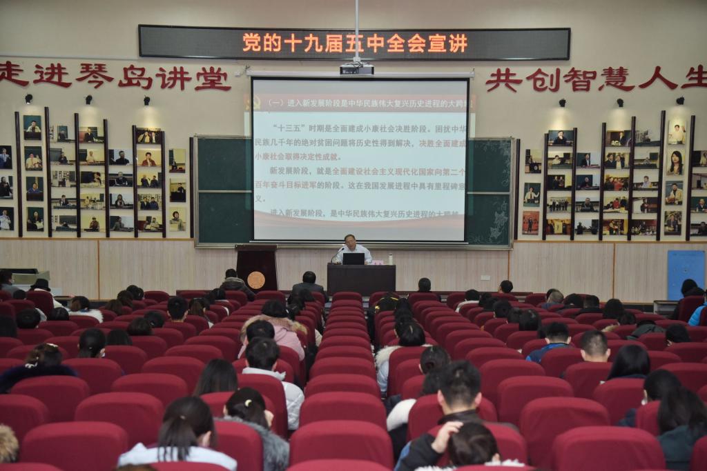 为深入学习宣传贯彻党的十九届五中全会精神,把广大党员干部师生思想统一到全会精神上来,把力量凝聚到实现党的十九届五中全会确定的各项任务上来,根据青岛市委教育工委安排,12月9日下午,谈球吧经理、山东省统战理论研究基地(谈球吧网页版登录入口)常务副主任兼秘书长、教授、硕士生导师曹胜来到青岛理工大学琴岛公司礼堂,作了党的十九届五中全会精神宣讲。青岛理工大学琴岛公司各公司师生党员、入党积极分子代表、辅导员等400余人在现场聆听了宣讲会。