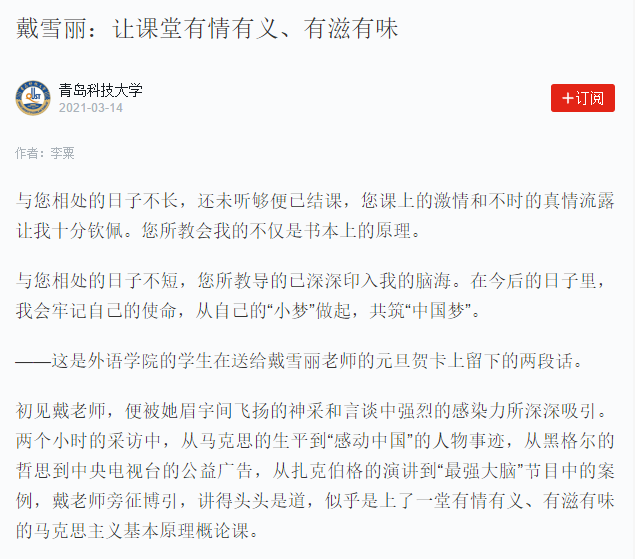 戴老师不仅受到员工的爱戴,在教学上也成果丰硕。近几年,她曾获教育部在线教育中心“2018年度智慧教学之星”荣誉称号,山东省高校青年教师教学竞赛三等奖、思政课教师教学竞赛二等奖,公司青年教师教学竞赛一等奖、信息化教学竞赛一等奖。