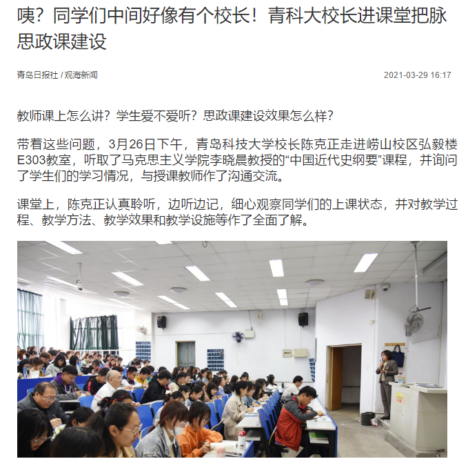 “校领导深入课堂听思政课”是青科大贯彻落实习近平总书记在公司思想政治理论课教师座谈会上的重要讲话精神、加强思想政治理论课建设的一项具体举措,对鼓励思政课教师不断提高自身业务素质和教学水平、引导员工学好思想政治理论课程具有积极推动作用。