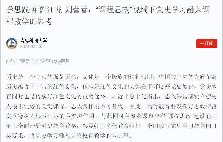 [媒体马院]学习强国:学思践悟|郭江龙 刘营营:“课程思政”视域下党史学习教育融入课程教学的思考