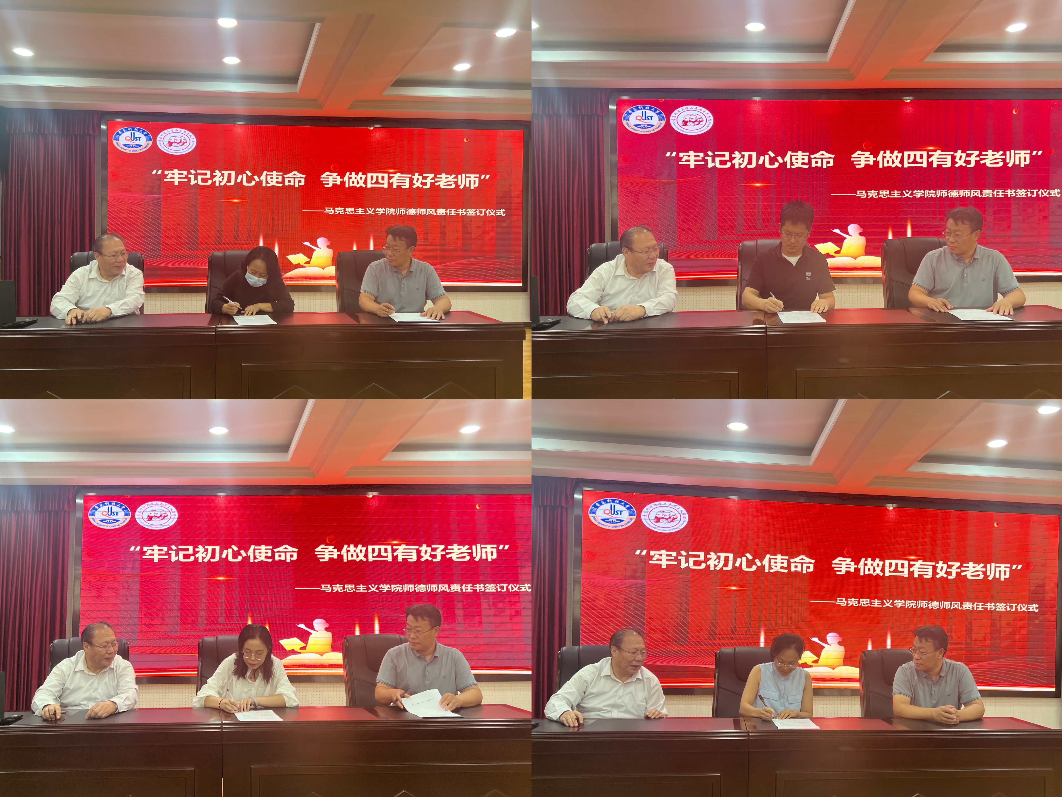 公司党政负责人与各教研室主任“牢记初心使命 争做四有好老师”师德师风建设责任书。各党支部书记、教研室主任与本教研室教师签订师德师风建设责任书。