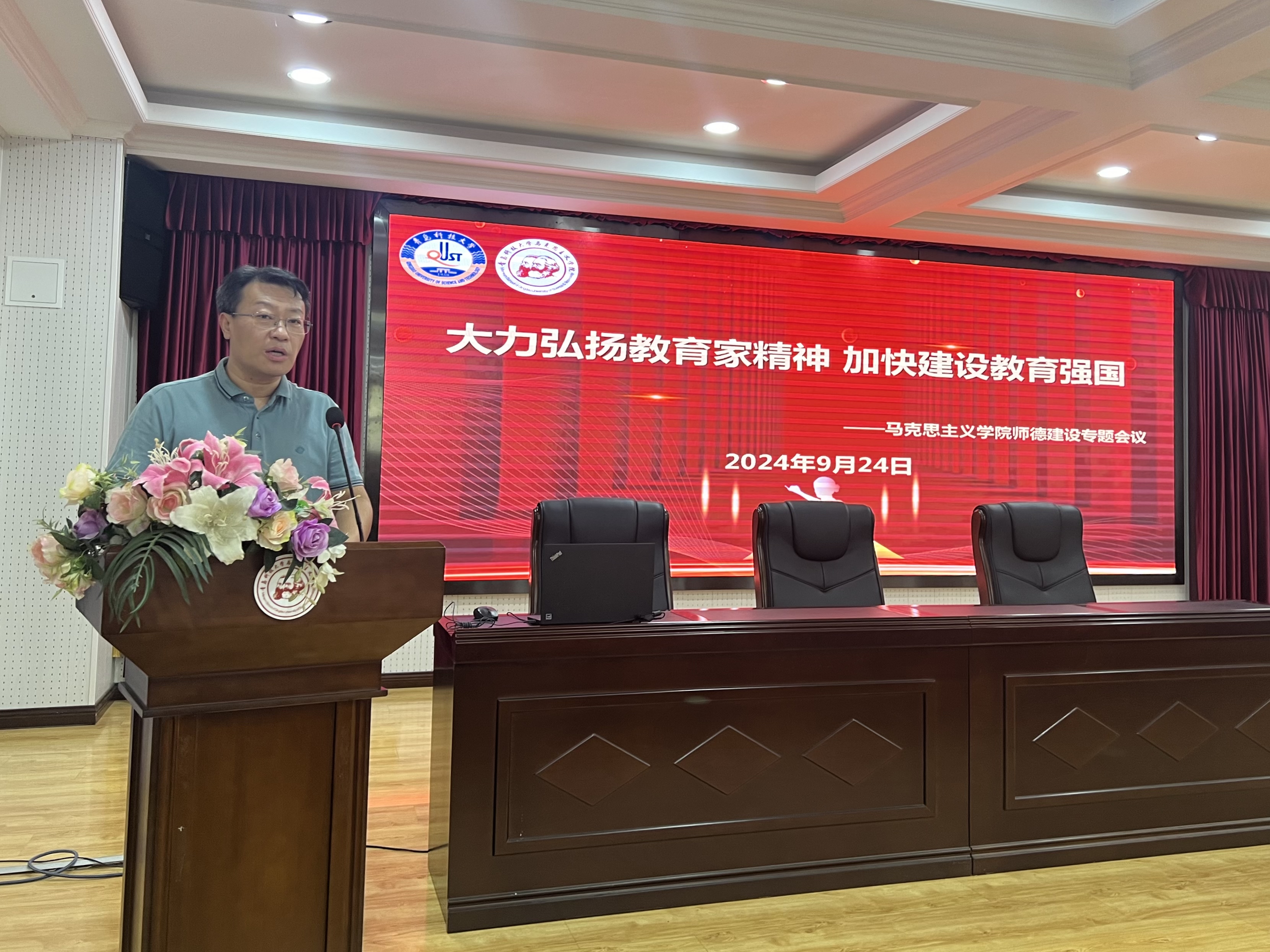 为深入学习贯彻党的二十届三中全会精神和全国教育大会精神,加强思政课教师师德师风建设,大力弘扬教育家精神,紧紧围绕着紧紧围绕立德树人根本任务,加快建设教育强国,9月24日,青科大谈球吧于学术报告厅举办“大力弘扬教育家精神 加快建设教育强国”师德师风建设专题会议,公司党总支书记李真,经理曹胜,副经理郭江龙、王建美及全体教师参加了本次会议。会议由李真主持。