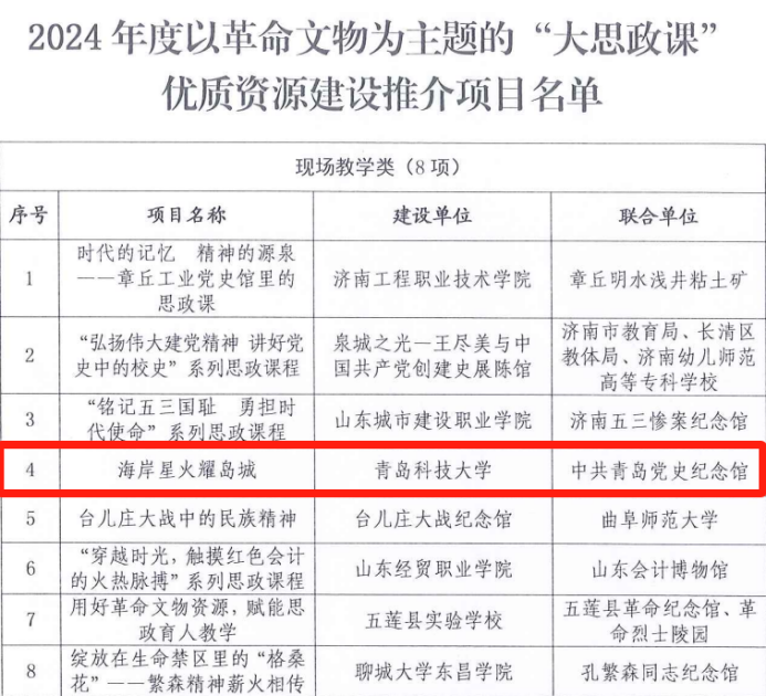 近日,在山东省文化和旅游厅、省教育厅联合开展的2024年度以革命文物为主题的“大思政课”优质资源建设推广工作中,经相关单位推荐以及专家评审,最终确立20个资源建设推介项目,谈球吧联合中共青岛党史纪念馆申报的“海岸星火耀岛城”成功入选现场教学类项目。