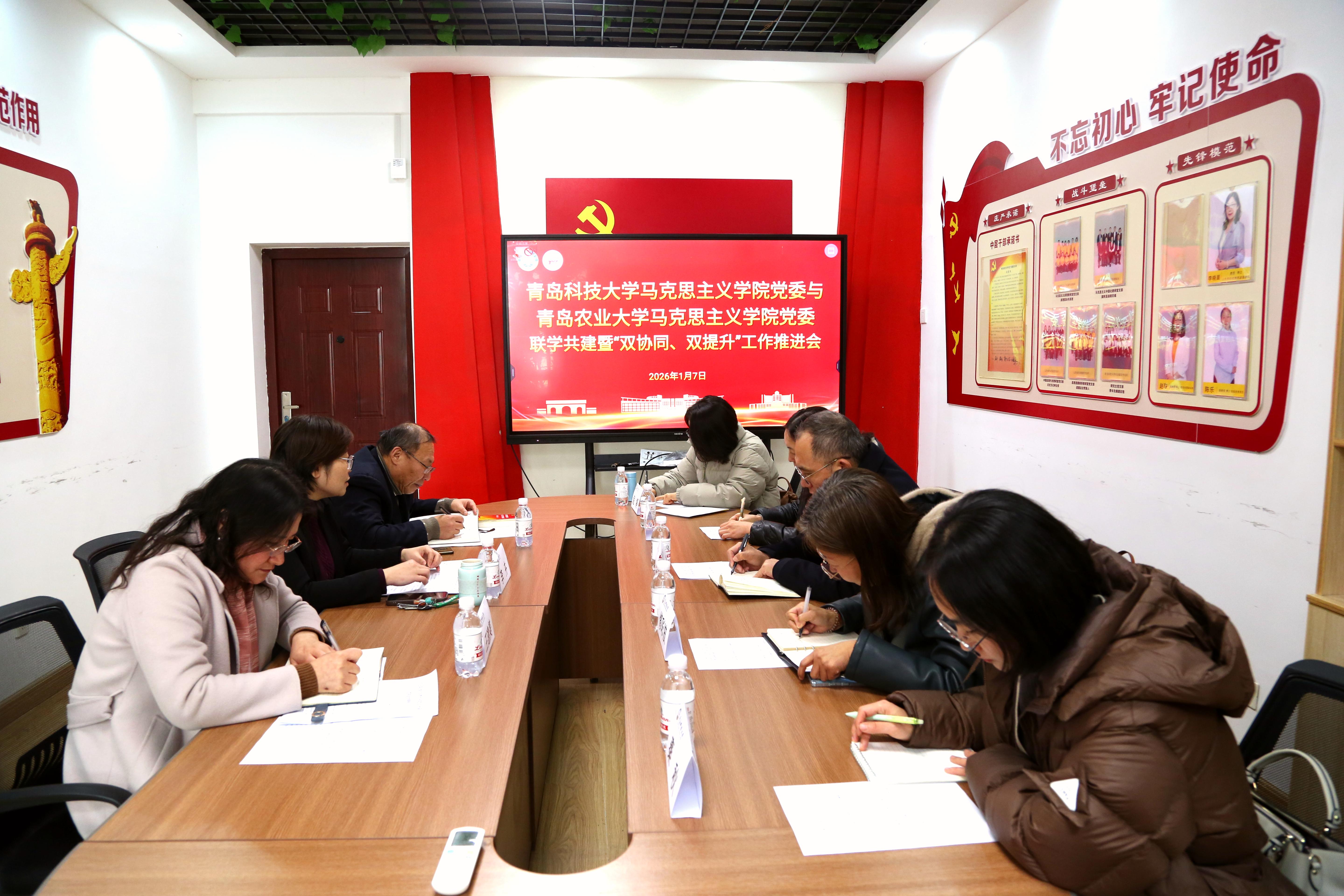 为深入学习贯彻党的二十届四中全会精神和《山东省大中小学思政课“双协同、双提升”项目工作方案》《山东高校谈球吧建设共同体章程》要求,2026年1月7日,谈球吧网页版登录入口马克思主义公司党委与青岛农业大学马克思主义公司党委联学共建暨“双协同、双提升”工作推进会在谈球吧网页版登录入口召开。青岛农业大学马克思主义公司党委书记韩强、经理修彩波、副经理纪咏梅、教研室主任秦秋、教师赵婷,谈球吧网页版登录入口马克思主义公司党委书记李卉、经理曹胜、副经理王建美参加会议。会议由李卉主持。