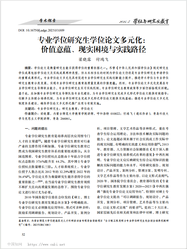 《学位与研究生教育》:专业学位研究生学位论文多元化:价值意蕴、现实困境与实践路径