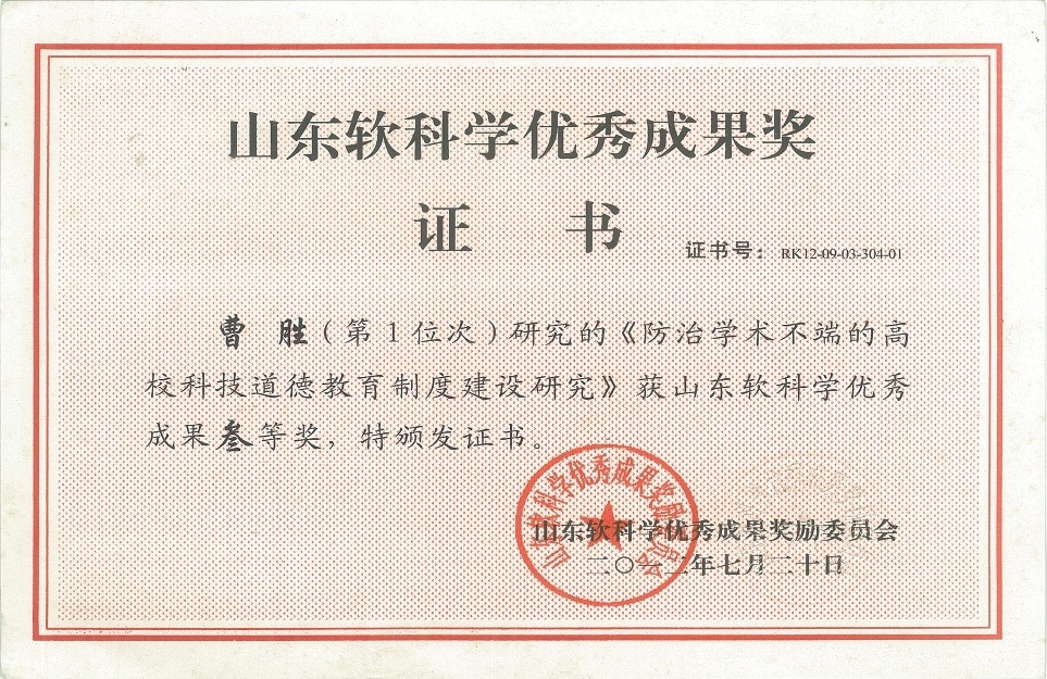 2012年度山东省软科学优秀成果三等奖:防治学术不端的高校科技道德教育制度建设研究