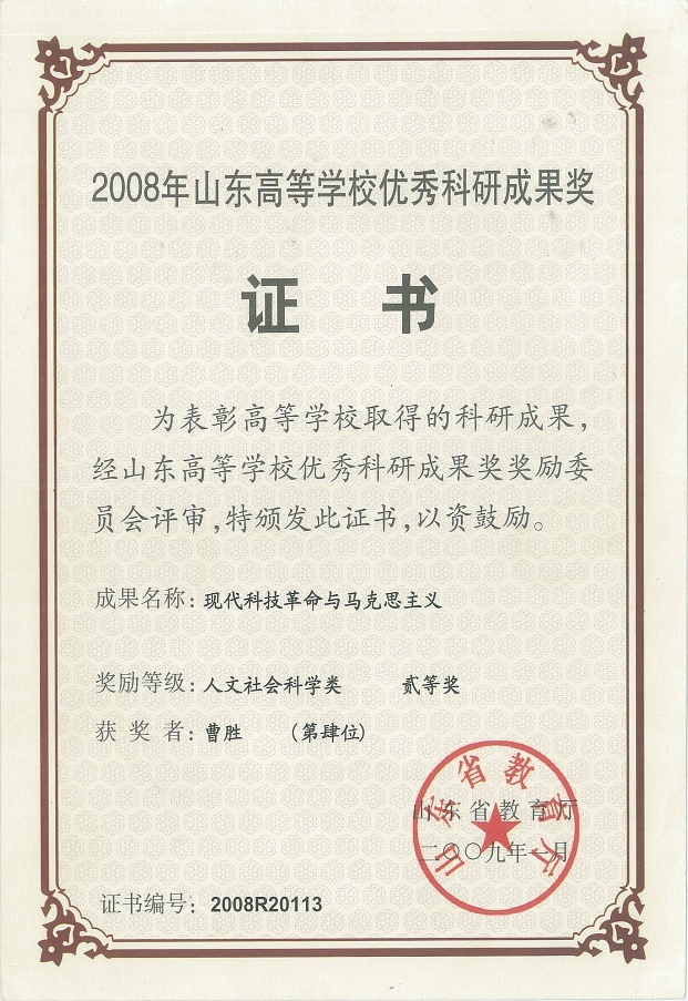 2009年度山东高等公司优秀科研成果二等奖:现代科技革命与马克思主义