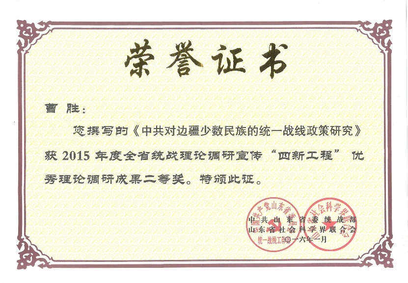 2012年度山东省统战理论调研宣传“四新工程”优秀理论调研成果二等奖:中共对边疆少数民族的统一战线政策研究