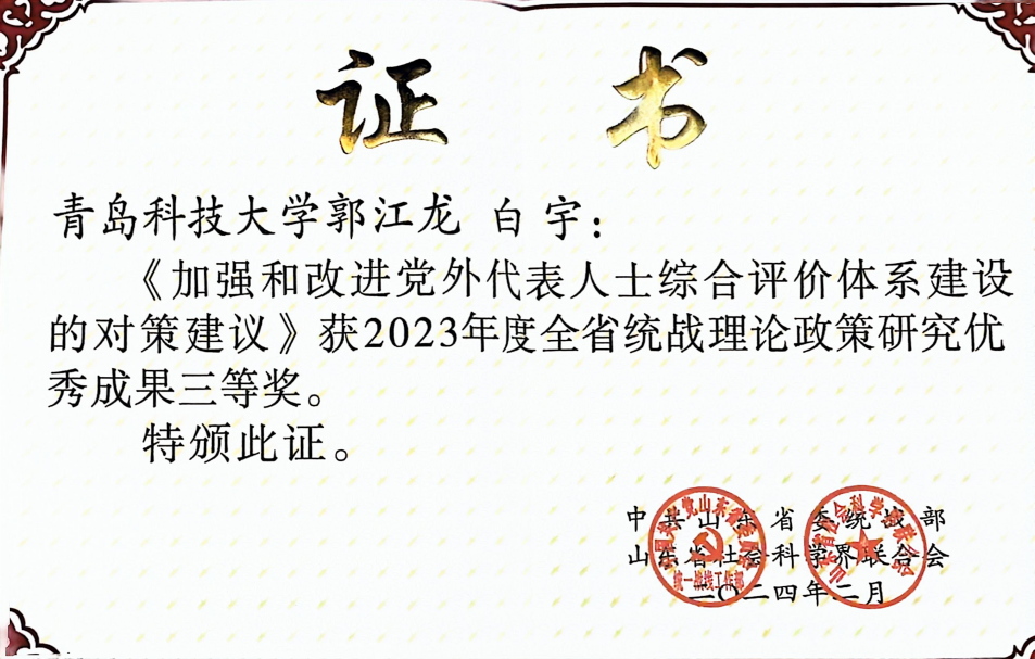 山东省统战理论优秀成果三等奖:郭江龙