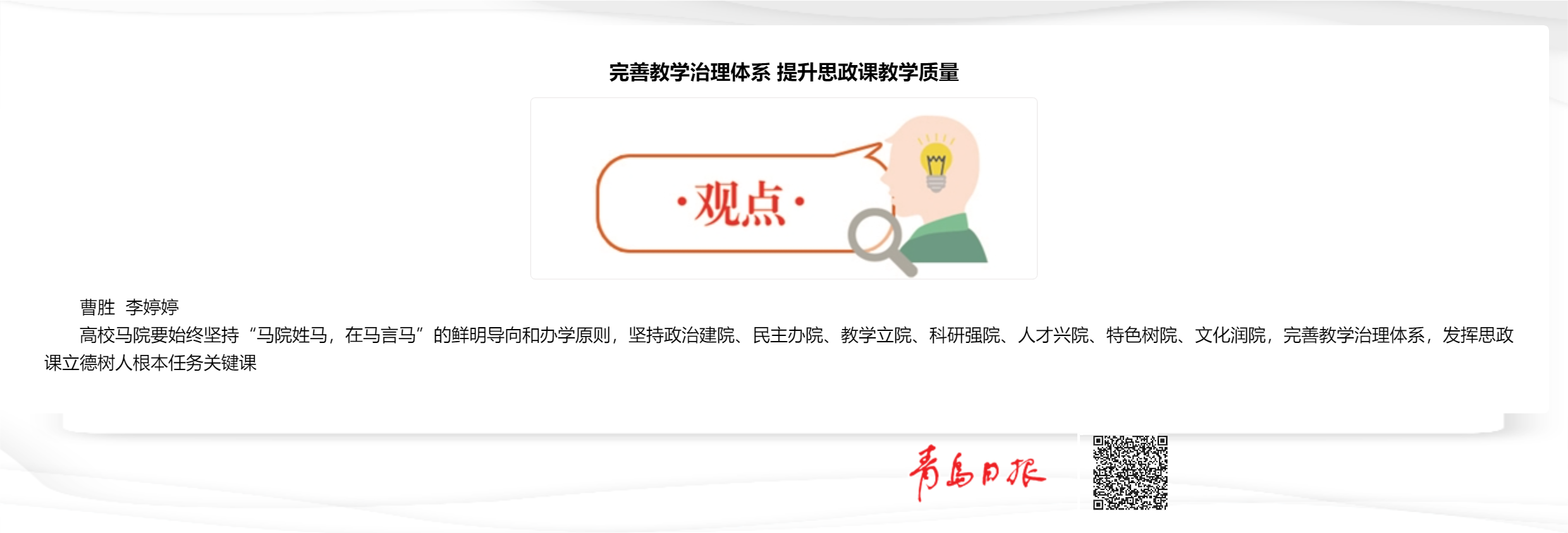 青岛日报:“曹胜 李婷婷--完善教学治理体系 提升思政课教学质量”