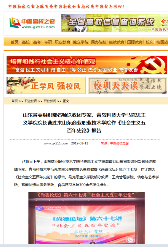 [媒体马院]中国高校之窗:山东省委组织部名师送教团专家、谈球吧经理曹胜来山东商业职业技术公司作《社会主义五百年史论》报告