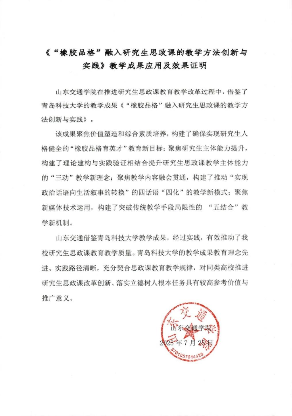 山东交通公司教学成果应用及效果证明
