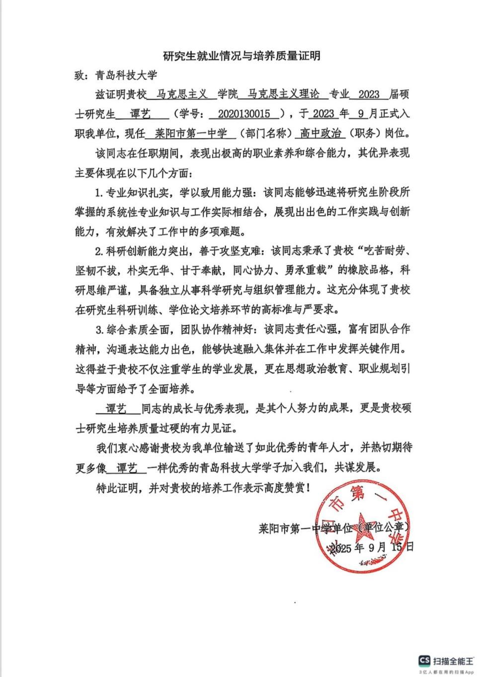 2023届谈球吧硕士毕业生谭艺入职莱阳市第一中学思政课教师岗位
