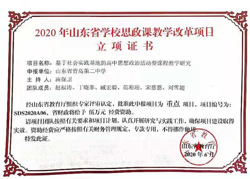 2020年山东省公司思政课教学改革项目:《基于社会实践基地的高中思想政治活动型课程教学研究》