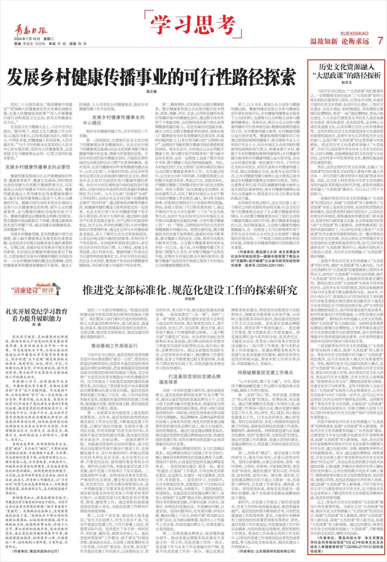青岛日报20240716:《历史文化资源融入“大思政课”的路径探析》