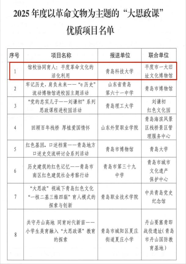 青岛市2025年度以革命文物为主题的“大思政课”优质项目