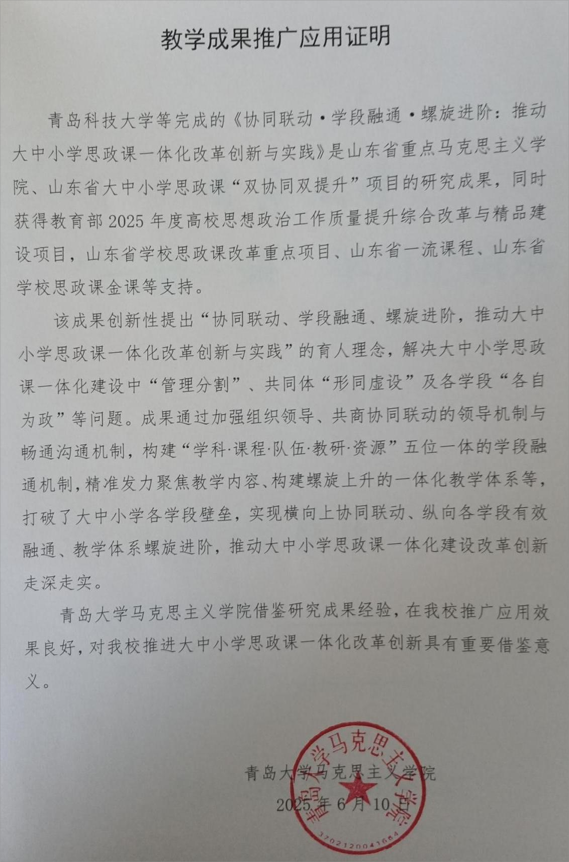 青岛大学教学成果推广应用证明