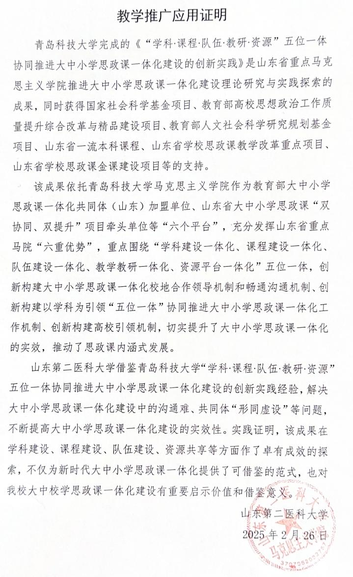 山东第二医科大学教学成果推广应用证明