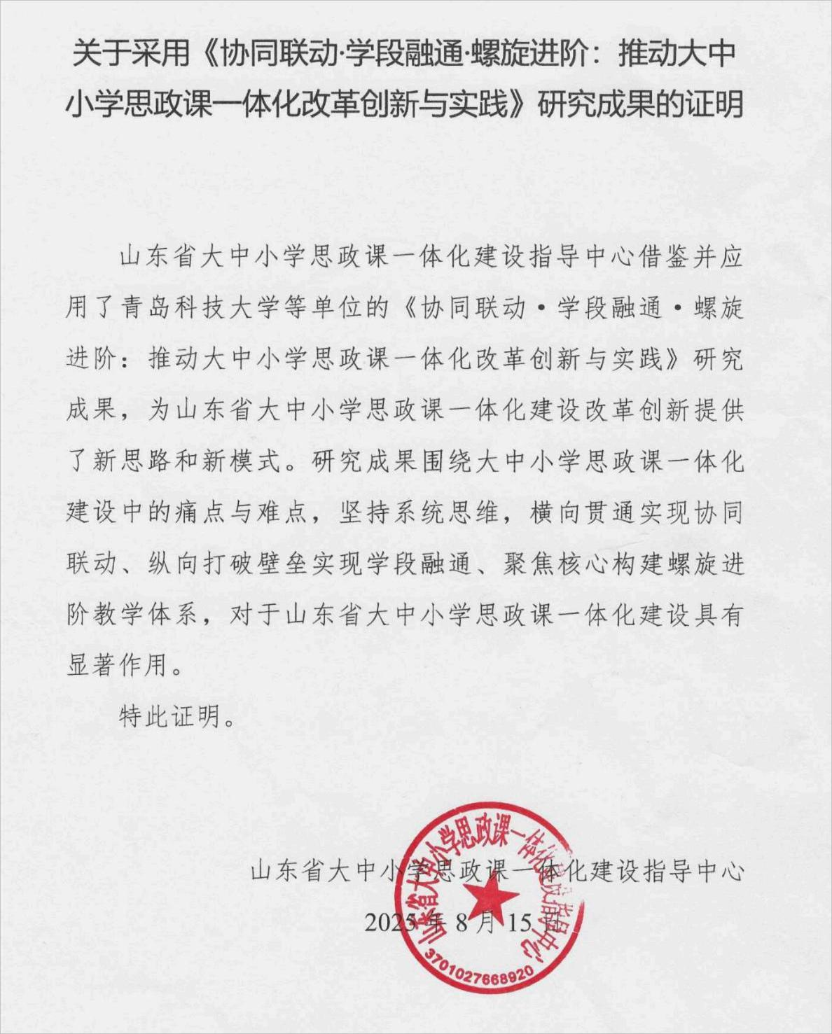 山东省大中小学思政课一体化建设指导中心应用证明